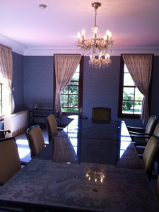 壁と絨毯とカーテン、窓、シャンデリア、椅子 、光の入り具合まで
