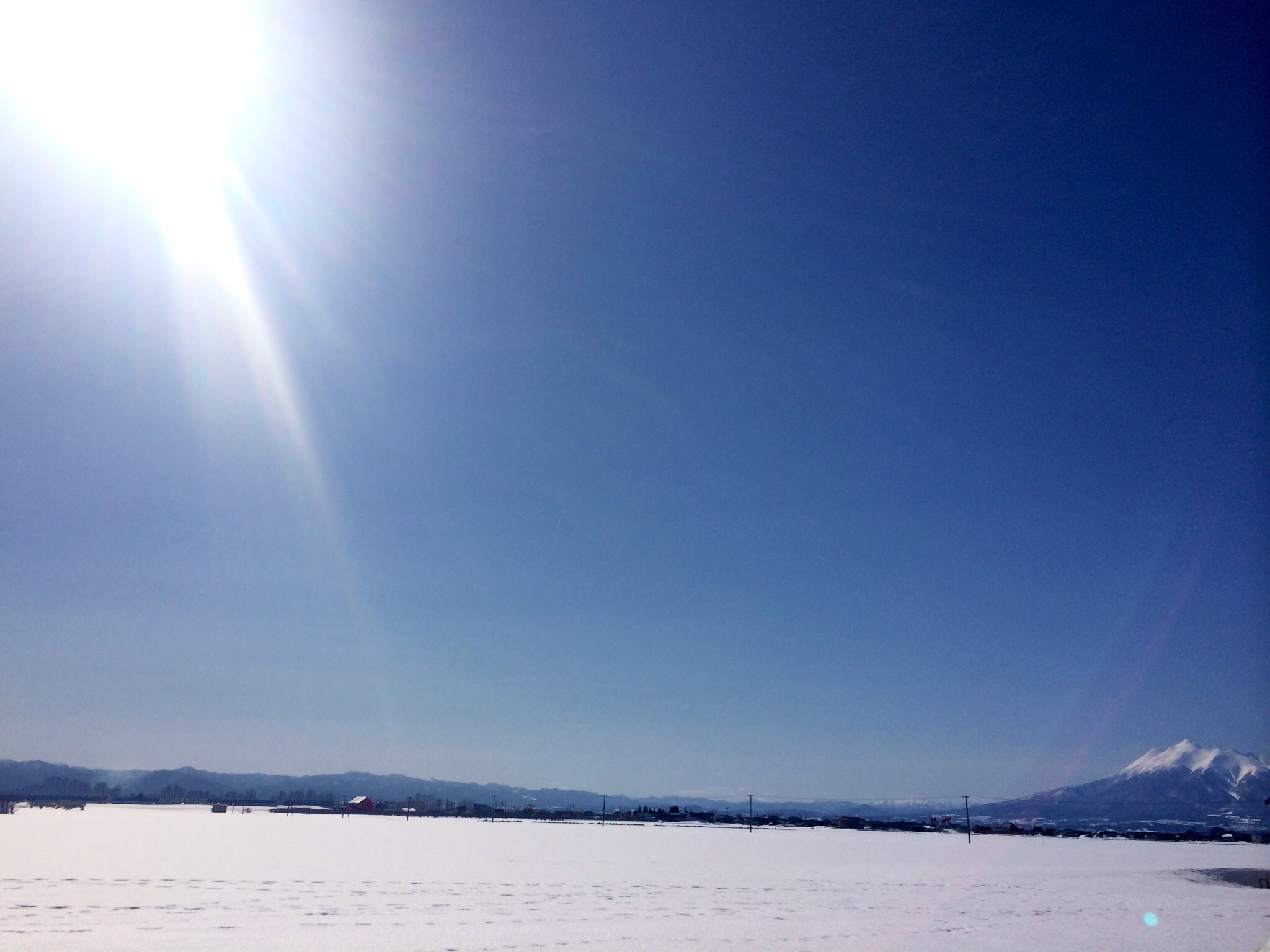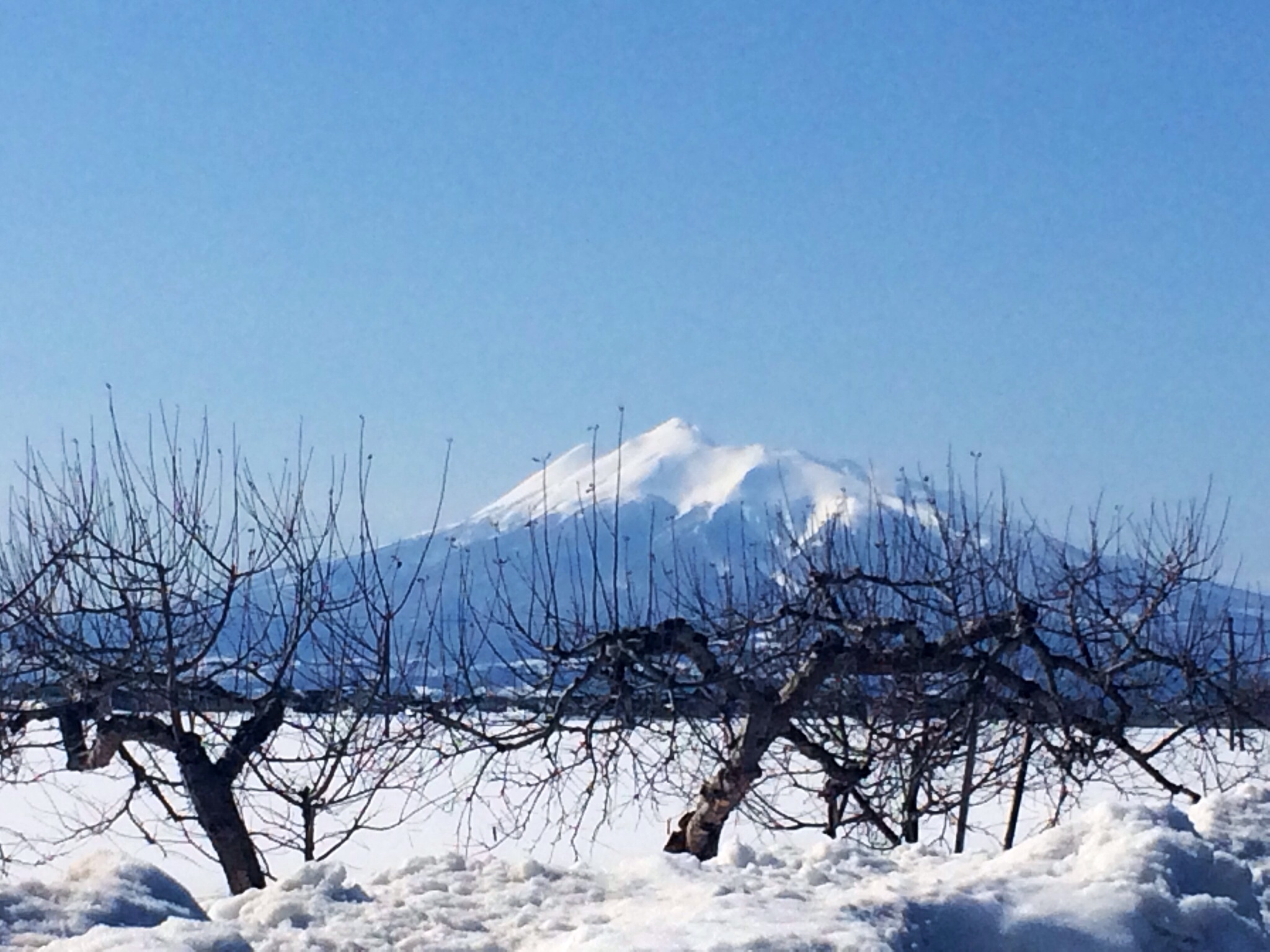 雪に埋もれたりんご畑と真っ白な岩木山。