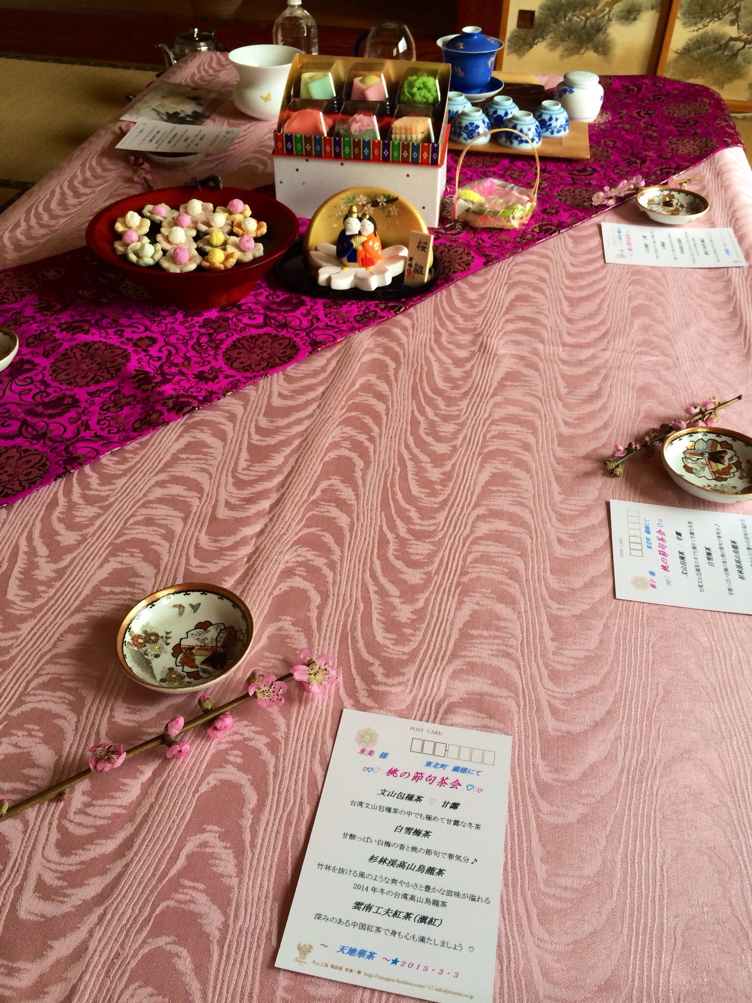 桃や桜やピンクの花や色は永遠の乙女心ですね♪♪♪中国茶は、春茶がこれからなので、味わい深い冬茶をメインに優しく旨味たっぷりのお茶を飲んで、心身豊かに桃の節句をご一緒に楽しませていただきました♪♪♪初めてご参加の方も喜んでいただけたようです(^^)